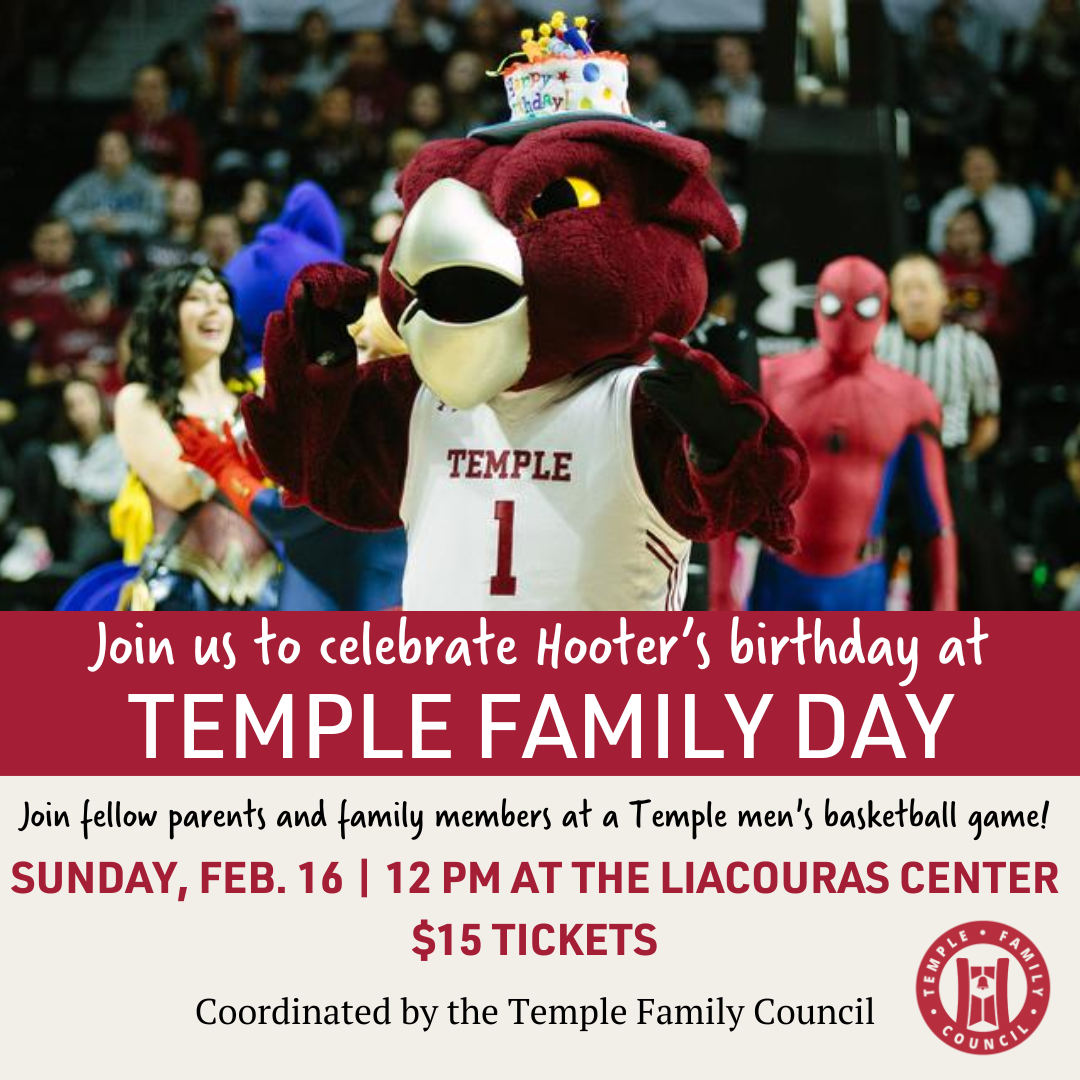 Come out on February 16th at 12pm and join other Temple parents and family members for a fun day watching the Temple Owls take on the Florida Atlantic University Owls at the Liacouras Center. We will also be celebrating Hooter's birthday! We have blocked off a section of the stadium to sit, cheer and visit together.