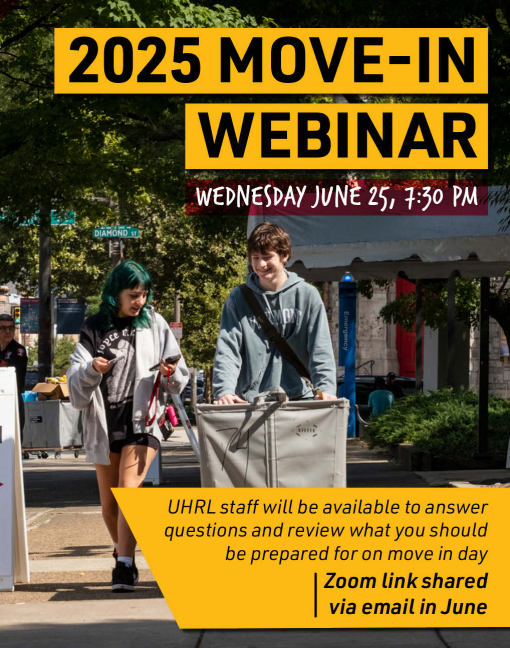 Get ready for move in! Join the UHRL staff as we review what to expect for move in day as well as when move in appointments will be available. Zoom link shared via email with students.